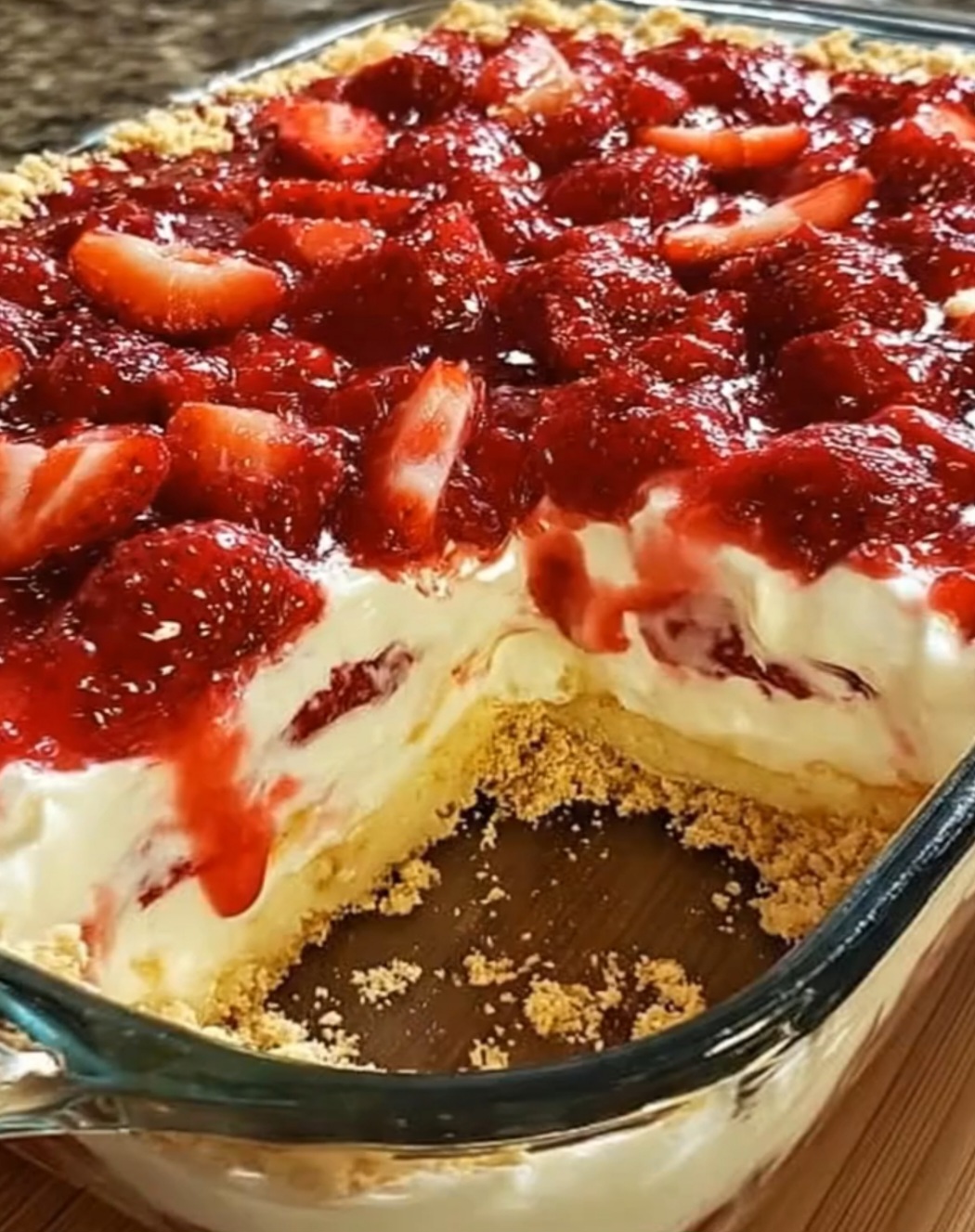 Sprinkle the dry cake mix evenly over the cream cheese and strawberry layers. Do not mix it in. The cake mix will create the topping that bakes into a slightly crisp, buttery crust.